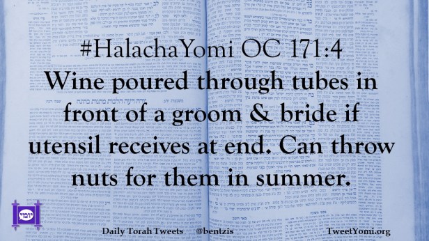 #HalachaYomi OC 171:4 Wine poured through tubes in front of a groom & bride if utensil receives at end. Can throw nuts for them in summer.