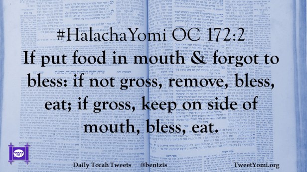 #HalachaYomi OC 172:2 If put food in mouth & forgot to bless: if not gross, remove, bless, eat; if gross, keep on side of mouth, bless, eat.