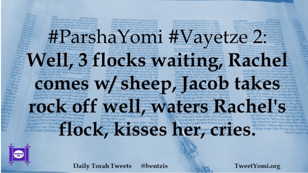 #ParshaYomi #Vayetze 2: Well, 3 flocks waiting, Rachel comes w/ sheep, Jacob takes rock off well, waters Rachel’s flock, kisses her, cries.