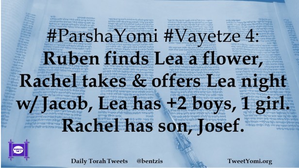 #ParshaYomi #Vayetze 4: Ruben finds Lea a flower, Rachel takes & offers Lea night w/ Jacob, Lea has +2 boys, 1 girl. Rachel has son, Josef.