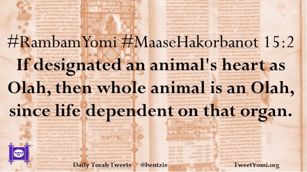 #RambamYomi #MaaseHakorbanot 15:2 If designated an animal’s heart as Olah, then whole animal is an Olah, since life dependent on that organ.