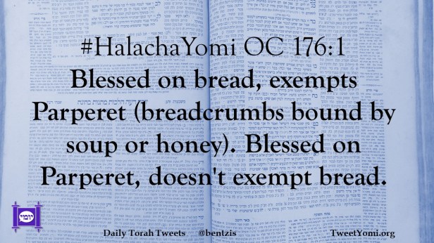 #HalachaYomi OC 176:1 Blessed on bread, exempts Parperet (breadcrumbs bound by soup or honey). Blessed on Parperet, doesn’t exempt bread.