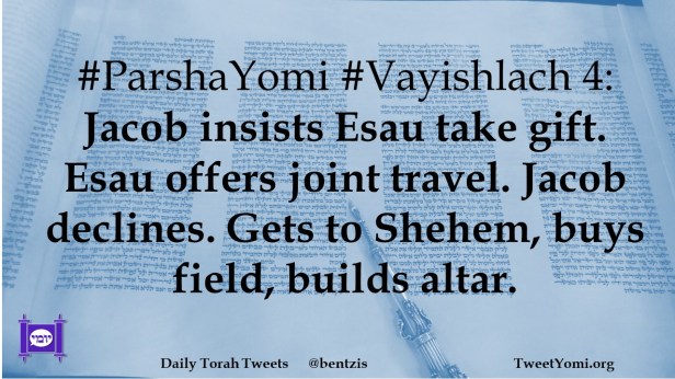 #ParshaYomi #Vayishlach 4: Jacob insists Esau take gift. Esau offers joint travel. Jacob declines. Gets to Shehem, buys field, builds altar.