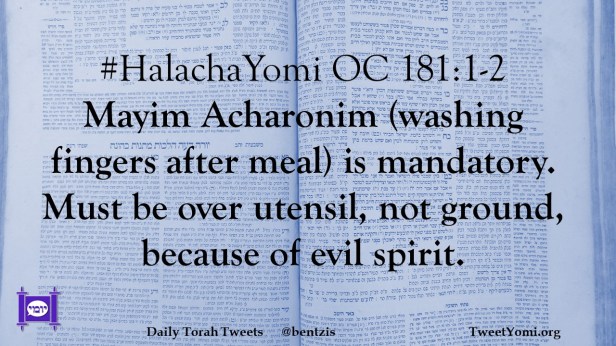 #HalachaYomi OC 181:1-2 Mayim Acharonim (washing fingers after meal) is mandatory. Must be over utensil, not ground, because of evil spirit.
