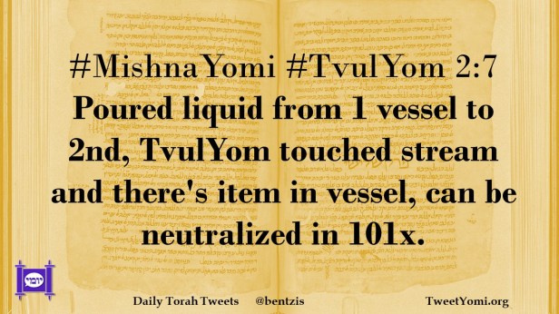 #MishnaYomi #TvulYom 2:7 Poured liquid from 1 vessel to 2nd, TvulYom touched stream and there’s item in vessel, can be neutralized in 101x.