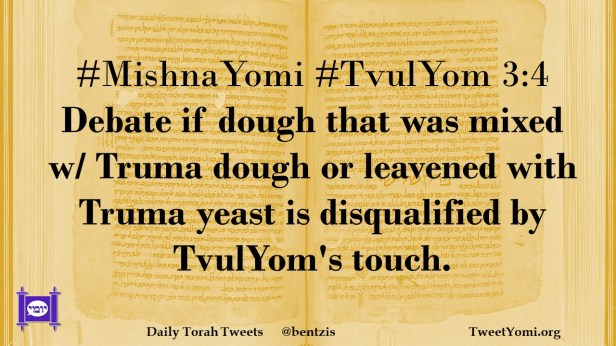 #MishnaYomi #TvulYom 3:4 Debate if dough that was mixed w/ Truma dough or leavened with Truma yeast is disqualified by TvulYom’s touch.