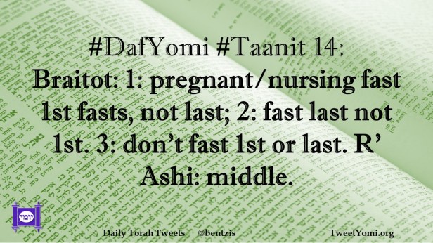 DafYomi, Taanit #DafYomi #Taanit 14 Date: November 26, 2021Author: ysspitz #DafYomi #Taanit 14: Braitot:1: pregnant/nursing fast 1st fasts, not last; 2: fast last not 1st. 3: don’t fast 1st or last. R’ Ashi: middle. Share this: Share on X (Opens in new window) X Share on Facebook (Opens in new window) Facebook Like Loading... Related