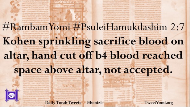 #RambamYomi #PsuleiHamukdashim 2:7 Kohen sprinkling sacrifice blood on altar, hand cut off b4 blood reached space above altar, not accepted.
