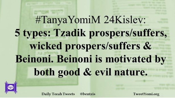 #TanyaYomiM 24Kislev: 5 types: Tzadik prospers/suffers, wicked prospers/suffers & Beinoni. Beinoni is motivated by both good & evil nature.