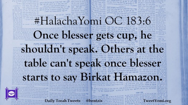 #HalachaYomi OC 183:6 Once blesser gets cup, he shouldn’t speak. Others at the table can’t speak once blesser starts to say Birkat Hamazon.