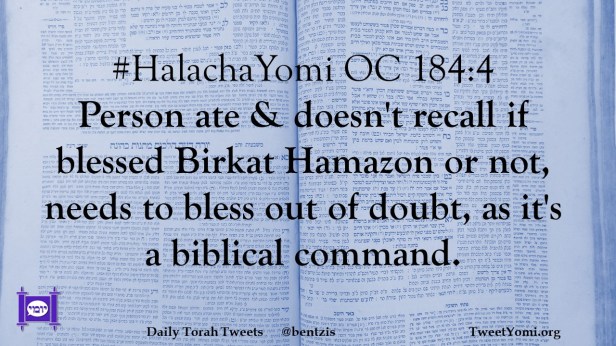 #HalachaYomi OC 184:4 Person ate & doesn’t recall if blessed Birkat Hamazon or not, needs to bless out of doubt, as it’s a biblical command.