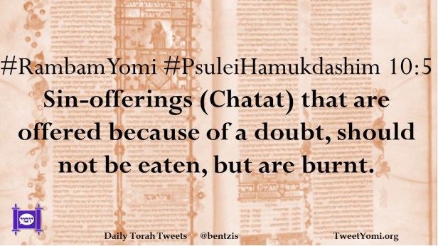 #RambamYomi #PsuleiHamukdashim 10:5 Sin-offerings (Chatat) that are offered because of a doubt, should not be eaten, but are burnt.