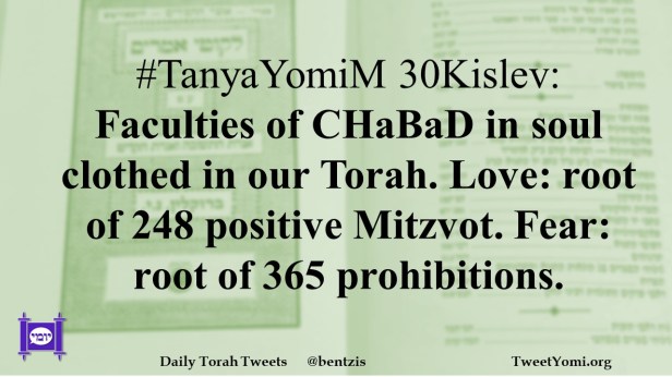 #TanyaYomiM 30Kislev: Faculties of CHaBaD in soul clothed in our Torah. Love: root of 248 positive Mitzvot. Fear: root of 365 prohibitions.
