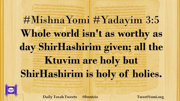 #MishnaYomi #Yadayim 3:5 Whole world isn’t as worthy as day ShirHashirim given; all the Ktuvim are holy but ShirHashirim is holy of holies.
