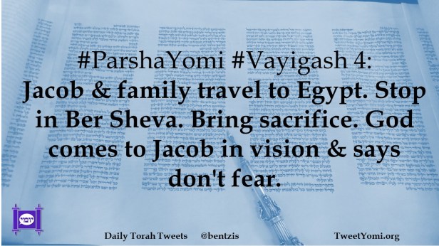 #ParshaYomi #Vayigash 4: Jacob & family travel to Egypt. Stop in Ber Sheva. Bring sacrifice. God comes to Jacob in vision & says don’t fear.