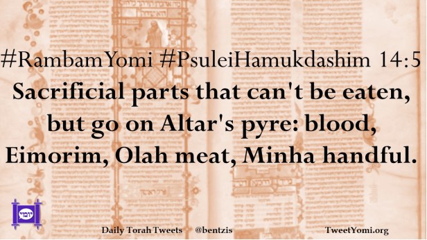 #RambamYomi #PsuleiHamukdashim 14:5 Sacrificial parts that can’t be eaten, but go on Altar’s pyre: blood, Eimorim, Olah meat, Minha handful.