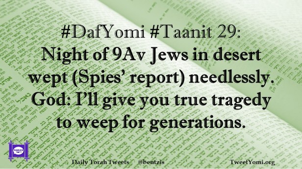 DafYomi, Taanit #DafYomi #Taanit 29 Date: December 10, 2021Author: ysspitz #DafYomi #Taanit 29: Night of 9Av Jews in desert wept (Spies’ report) needlessly. God: I’ll give you true tragedy to weep for generations. Share this: Share on X (Opens in new window) X Share on Facebook (Opens in new window) Facebook Like Loading... Related