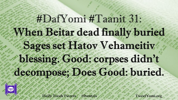 DafYomi, Taanit #DafYomi #Taanit 31 Date: December 13, 2021Author: ysspitz #DafYomi #Taanit 31: When Beitar dead finally buried Sages set Hatov Vehameitiv blessing. Good: corpses didn’t decompose; Does Good: buried. Share this: Share on X (Opens in new window) X Share on Facebook (Opens in new window) Facebook Like Loading... Related