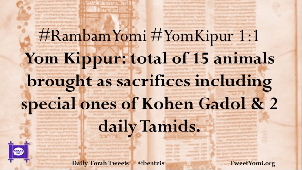 #RambamYomi #YomKipur 1:1 Yom Kippur: total of 15 animals brought as sacrifices including special ones of Kohen Gadol & 2 daily Tamids.