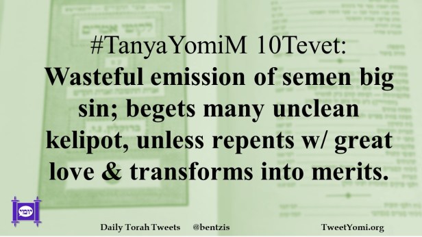 #TanyaYomiM 10Tevet: Wasteful emission of semen big sin; begets many unclean kelipot, unless repents w/ great love & transforms into merits.