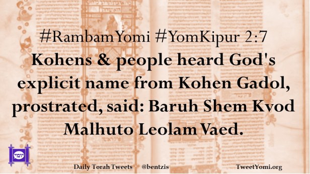 #RambamYomi #YomKipur 2:7 Kohens & people heard God’s explicit name from Kohen Gadol, prostrated, said: Baruh Shem Kvod Malhuto Leolam Vaed.