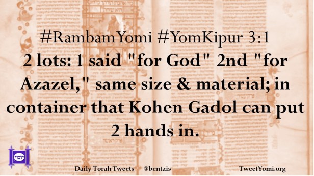#RambamYomi #YomKipur 3:1 2 lots: 1 said “for God” 2nd “for Azazel,” same size & material; in container that Kohen Gadol can put 2 hands in.