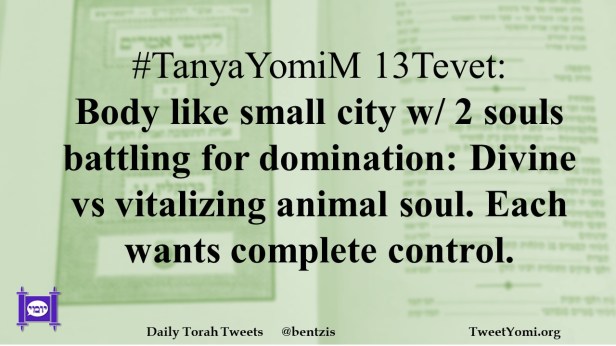 #TanyaYomiM 13Tevet: Body like small city w/ 2 souls battling for domination: Divine vs vitalizing animal soul. Each wants complete control.