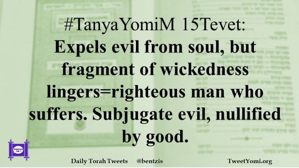 #TanyaYomiM 15Tevet: Expels evil from soul, but fragment of wickedness lingers=righteous man who suffers. Subjugate evil, nullified by good.