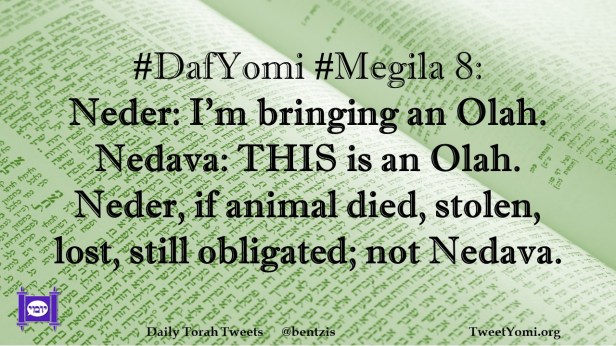 DafYomi, Megila #DafYomi #Megila 8 Date: December 20, 2021Author: ysspitz #DafYomi #Megila 8: Neder: I’m bringing an Olah. Nedava: THIS is an Olah. Neder, if animal died, stolen, lost, still obligated; not Nedava. Share this: Share on X (Opens in new window) X Share on Facebook (Opens in new window) Facebook Like Loading... Related