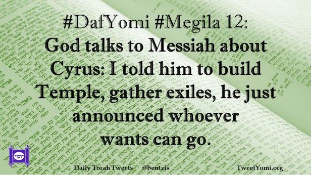 DafYomi, Megila #DafYomi #Megila 12 Date: December 24, 2021Author: ysspitz #DafYomi #Megila 12: God talks to Messiah about Cyrus: I told him to build Temple, gather exiles, he just announced whoever wants can go. Share this: Share on X (Opens in new window) X Share on Facebook (Opens in new window) Facebook Like Loading... Related