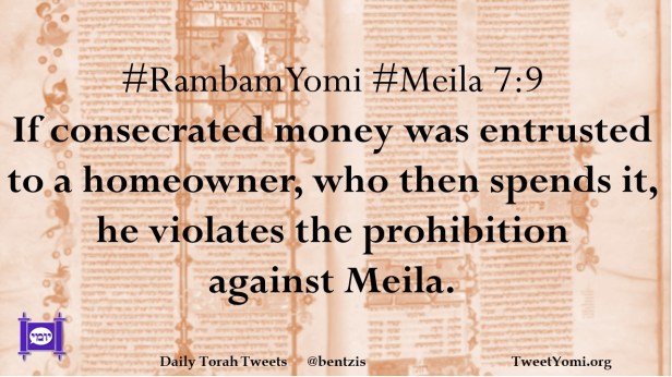 #RambamYomi #Meila 7:9 If consecrated money was entrusted to a homeowner, who then spends it, he violates the prohibition against Meila.