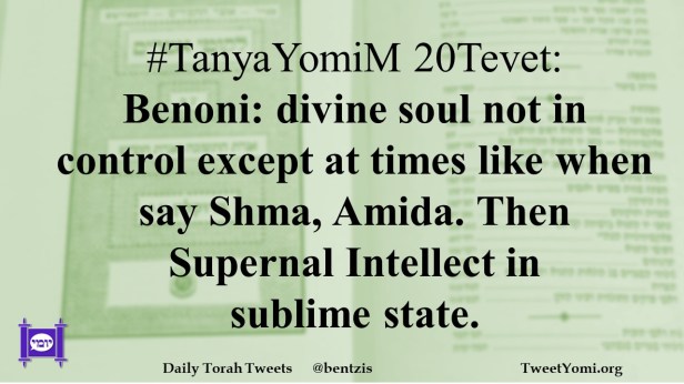 #TanyaYomiM 20Tevet: Benoni: divine soul not in control except at times like when say Shma, Amida. Then Supernal Intellect in sublime state.