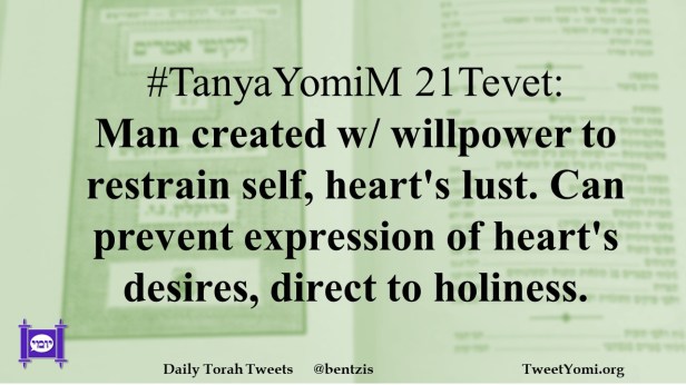#TanyaYomiM 21Tevet: Man created w/ willpower to restrain self, heart’s lust. Can prevent expression of heart’s desires, direct to holiness.