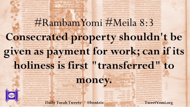 #RambamYomi #Meila 8:3 Consecrated property shouldn’t be given as payment for work; can if it’s holiness is first “transferred” to money.
