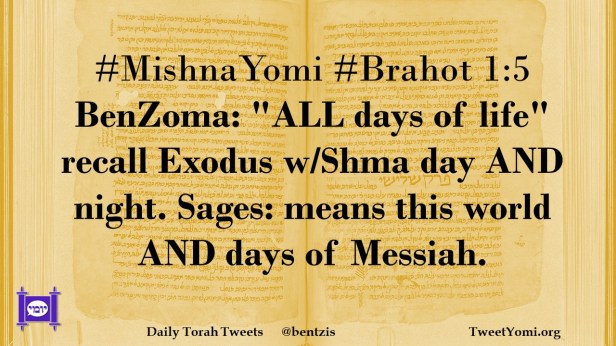 #MishnaYomi #Brahot 1:5 BenZoma: “ALL days of life” recall Exodus w/Shma day AND night. Sages: means this world AND days of Messiah.