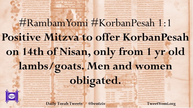#RambamYomi #KorbanPesah 1:1 Positive Mitzva to offer KorbanPesah on 14th of Nisan, only from 1 yr old lambs/goats. Men and women obligated.