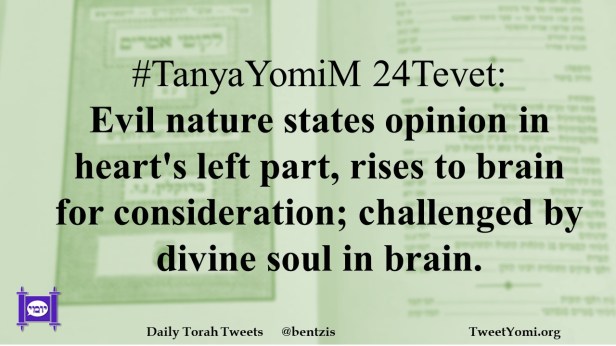 #TanyaYomiM 24Tevet: Evil nature states opinion in heart’s left part, rises to brain for consideration; challenged by divine soul in brain.