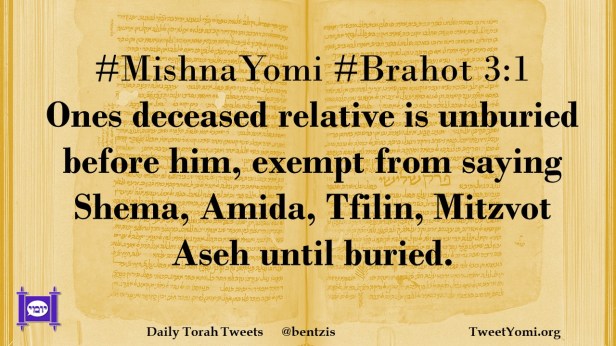 #MishnaYomi #Brahot 3:1 Ones deceased relative is unburied before him, exempt from saying Shema, Amida, Tfilin, Mitzvot Aseh until buried.