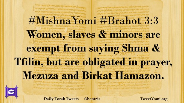#MishnaYomi #Brahot 3:3 Women, slaves & minors are exempt from saying Shma & Tfilin, but are obligated in prayer, Mezuza and Birkat Hamazon.