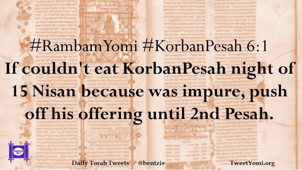 #RambamYomi #KorbanPesah 6:1 If couldn’t eat KorbanPesah night of 15 Nisan because was impure, push off his offering until 2nd Pesah.