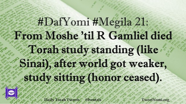 DafYomi, Megila #DafYomi #Megila 21 Date: January 2, 2022Author: ysspitz #DafYomi #Megila 21: From Moshe ’til R Gamliel died Torah study standing (like Sinai), after world got weaker, study sitting (honor ceased). Share this: Share on X (Opens in new window) X Share on Facebook (Opens in new window) Facebook Like Loading... Related