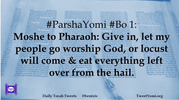 #ParshaYomi #Bo 1: Moshe to Pharaoh: Give in, let my people go worship God, or locust will come & eat everything left over from the hail.
