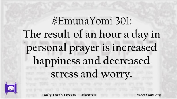 EmunaYomi #EmunaYomi 301 Date: January 3, 2022Author: ysspitz #EmunaYomi 301: The result of an hour a day in personal prayer is increased happiness and decreased stress and worry. Share this: Share on X (Opens in new window) X Share on Facebook (Opens in new window) Facebook Like Loading... Related