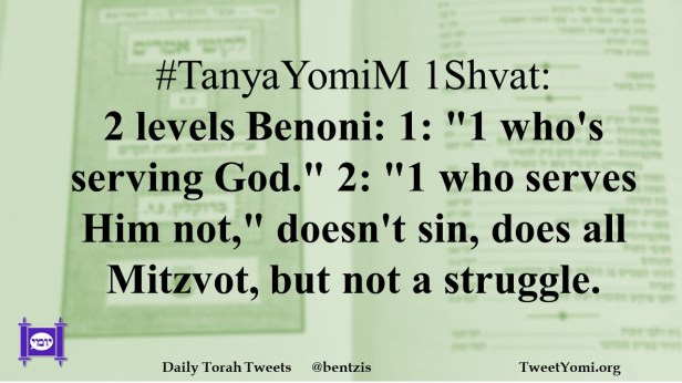 #TanyaYomiM 1Shvat: 2 levels Benoni: 1: “1 who’s serving God.” 2: “1 who serves Him not,” doesn’t sin, does all Mitzvot, but not a struggle.