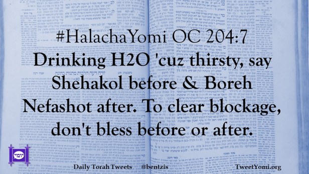 #HalachaYomi OC 204:7 Drinking H2O ‘cuz thirsty, say Shehakol before & Boreh Nefashot after. To clear blockage, don’t bless before or after.