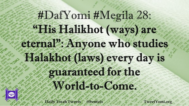 DafYomi, Megila #DafYomi #Megila 28 Date: January 9, 2022Author: ysspitz #DafYomi #Megila 28: “His Halikhot (ways) are eternal”: Anyone who studies Halakhot (laws) every day is guaranteed for the World-to-Come. Share this: Share on X (Opens in new window) X Share on Facebook (Opens in new window) Facebook Like Loading... Related