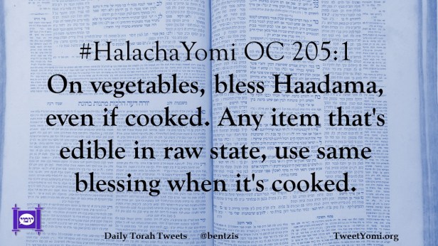 #HalachaYomi OC 205:1 On vegetables, bless Haadama, even if cooked. Any item that’s edible in raw state, use same blessing when it’s cooked.