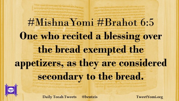 #MishnaYomi #Brahot 6:5 One who recited a blessing over the bread exempted the appetizers, as they are considered secondary to the bread.