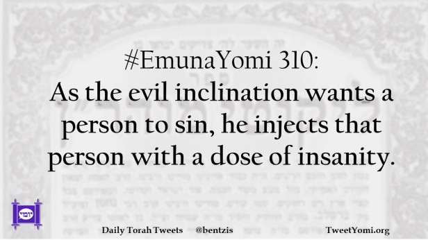 EmunaYomi #EmunaYomi 310 Date: January 13, 2022Author: ysspitz #EmunaYomi 310: As the evil inclination wants a person to sin, he injects that person with a dose of insanity. Share this: Share on X (Opens in new window) X Share on Facebook (Opens in new window) Facebook Like Loading... Related