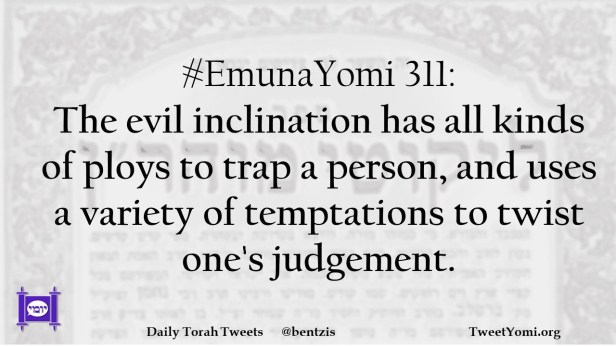 #EmunaYomi 311: The evil inclination has all kinds of ploys to trap a person, and uses a variety of temptations to twist one’s judgement.